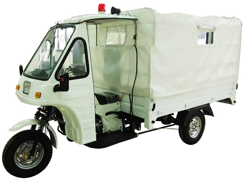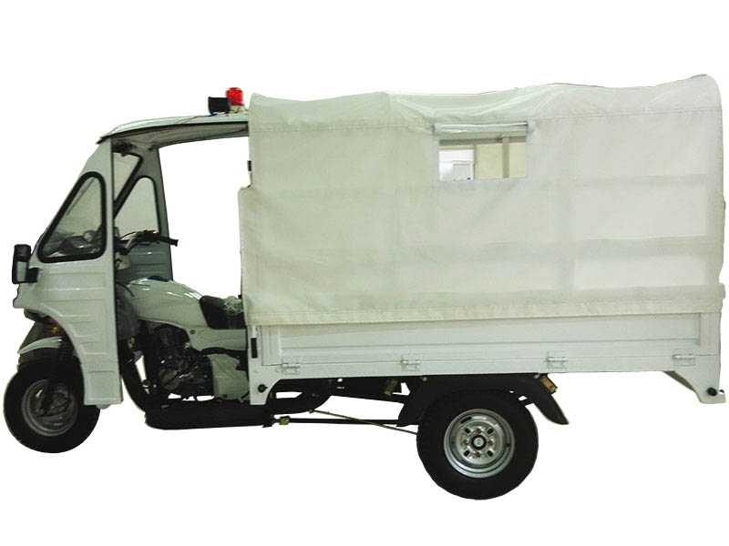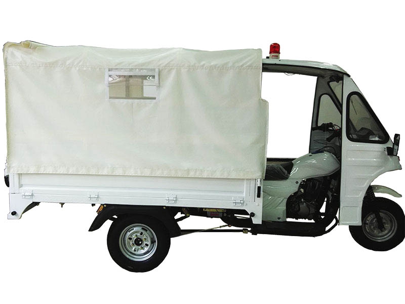 ZONLON Ambulance Tricycle ZL150ZK-CA Place of Origin:Chongqing,China Brand:ZONLON or OEM Model No.:ZL150ZK-CA Color:red,orange,blue,yellow,white,etc Size:3590×1400×1990mm ZL150ZK-CA 150cc Air-Cooled Canvas Ambulance Emergency Tricycle Specification Feature EngineEngine TypeSingle cylinder, air cooling, 4-strokeDisplacement149mlCompression ratio9.1:1Max power output8.5 / 8000 kw/r/min Max torque10 / 7500 N·m/r/ min ClutchWet, multi-plate, Pressure splashTransmission & Reverse5 forward gears + 1 reverseSteering mechanismSteering handle barChassisFR / RR 40×80 rectangular steel tubeFront suspensionSolo stem front shock absorber for Q1Rear suspensionIntegrated 7 pcs leaf spring, 4 bolts rear axle with booster and damperBraking systemFR 130, RR 180, mechanical brakingWheel tireFR / RR 4.50-12Battery12V / 9AhStarting methodElectric / kick starterFuel tankGasoline, 12LFuel consumption≤354Ground clearance160mmMax speed55km/h Overall dimensionWheel base2300mmDimension3590×1400×1990mmPassenger cabin2100×1400x1260mmSeats capacity1 patient + 2~3 doctors & nursesVehicle weightKerb 410 kgs, Pay load 300 kgsContainer load15 sets in CKD / 20GP; 32 sets in CKD /40HQ Catalogue download: ZONLON-Motor-Tricycle-ZL150ZK-CA