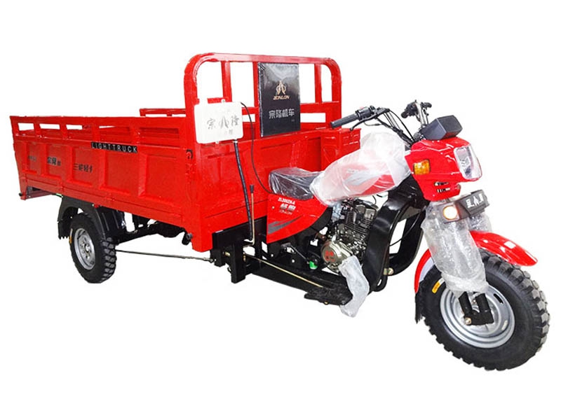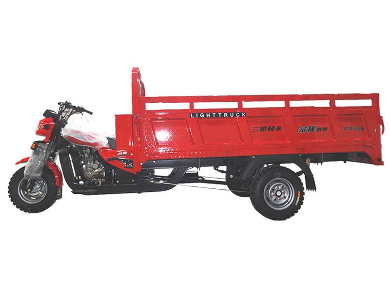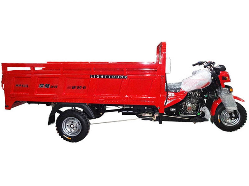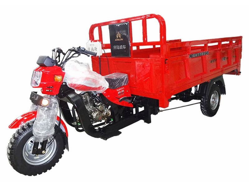 ZONLON Cargo Tricycle ZL200ZH-5 Place of Origin:Chongqing,China Brand:ZONLON or OEM Model No.:ZL200ZH-5 Color:red,orange,blue,yellow,white,etc Size:3400×1250×1550mm ZL200ZH-5 200cc Water-Cooled Load Truck Three Wheels Specification Feature EngineEngine typeSingle cylinder, water cooling, 4-stroke Displacement193mlCompression ratio9.0:1Max power output10.2 / 8000 kw/r/min Max torque14.5 / 6000 N·m/r/min ClutchWet multi-plate, Pressure splashTransmission & Reverse5 forward gears + 1 reverseSteering mechanismSteering handle barChassisFR / RR 50×100 rectangular steel tubeFront suspensionType 800 W270 solo front shock absorber with interchangeable wheelRear suspensionGreased outer mounting 5+4 conbined leaf spring, Semi-float Chan'an rear axleBraking systemFR 130, RR 220, mechanical brakingWheel tireFR / RR 4.50-12Battery12V / 28AhStarting methodElectric / Kick starterFuel tankGasoline, 12LFuel consumption≤354Ground clearance160mmMax speed60km/h Overall dimensionWheel base2200mmDimension3400×1250×1550mmCargo box size1800×1250mmVehicle weightKerb 420 kgs, Pay load 350 kgsContainer load20 sets in CKD / 20GP; 45 sets inCKD / 40HQOptioal parts1. Semi-Cabin2. Cargo box size and type optional on request3. Hydraulic braking system 4. Dumper system