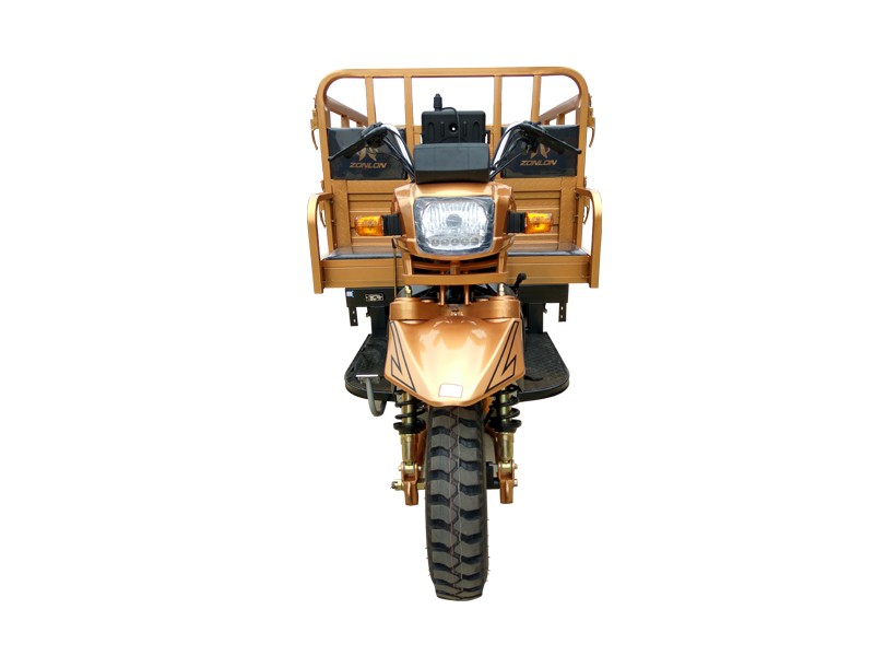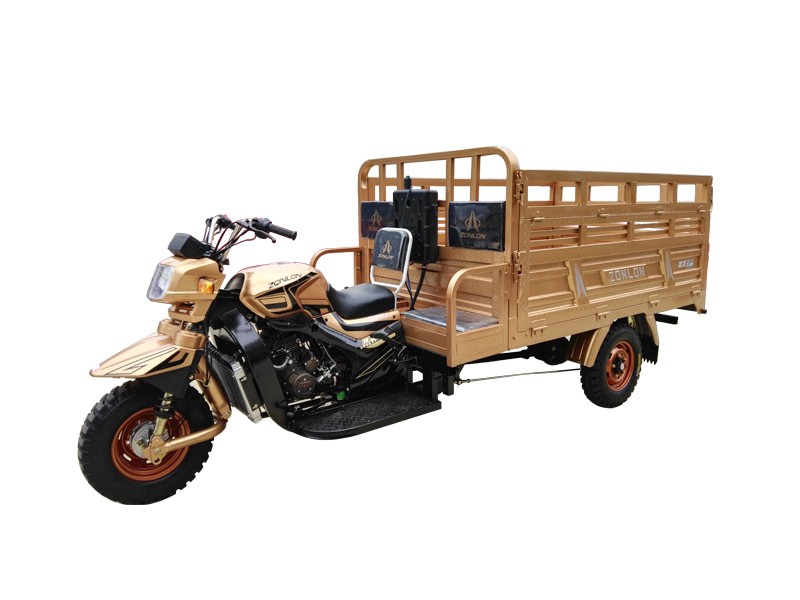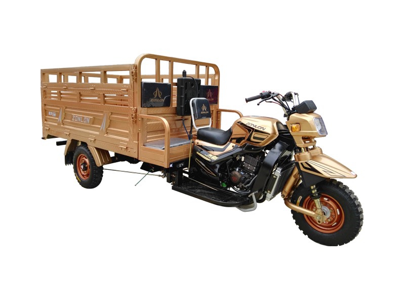 ZONLON Cargo Tricycle ZL200ZH-LB Place of Origin:Chongqing,China Brand:ZONLON or OEM Model No.:ZL200ZH-LB Color:red,orange,blue,yellow,white,etc Size:3400×1350×1550mm ZL200ZH-LB 200cc Water-Cooled Cargo Truck Motor Tricycle Specification Feature EngineEngine typeSingle cylinder, water cooling, 4-stroke Displacement197mlCompression ratio10.2:1Max power output10.3 / 7500 kw/r/min Max torque14.2 / 6000 N·m/r/ min ClutchWet multi-plate, Pressure splashTransmission & Reverse5 forward gears + 1 reverseSteering mechanismSteering handle barChassisFR / RR 50×100 rectangular steel tubeFront suspensionZONLON off-road shock absorberRear suspension7 pcs Pickup leaf spring, Ribbed JLW semi-float rear axle with booster Braking systemFR 130, RR 220, mechanical brakingWheel tireFR / RR 4.50-12Battery12V / 28AhStarting methodElectric / Kick starterFuel tankGasoline, 12LFuel consumption≤354Ground clearance160mmMax speed60km/h Overall dimensionWheel base2200mmDimension3400×1350×1550mmCargo box size1800×1350mmVehicle weightKerb 450 kgs, Pay load 350 kgsContainer load24 sets in CKD / 20GP; 52 sets in CKD / 40HQ Optioal parts1. Semi-Cabin2. Cargo box size and type optional on request3. Hydraulic braking system 4. Dumper systemCatalogue download: ZONLON-Motor-Tricycle-ZL200ZH-5N